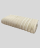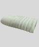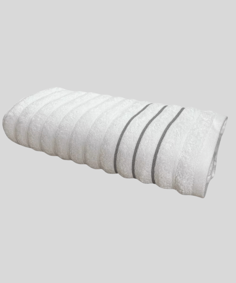 O design moderno da Toalha Corttex Wave se destaca pelas suas linhas em relevo, cuidadosamente distribuídas por toda a peça. Esse detalhe não só confere uma sensação de maior volume, mas também adiciona uma textura ainda mais aconchegante e sofisticada. A superfície geral da toalha é macia e com textura de laço, característica de artigos de banho de alta qualidade. Além disso, a toalha apresenta um padrão de listras horizontais finas na cor cinza escuro ou chumbo, que adicionam um contraste visual elegante ao branco predominante da peça.