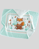 Baby Kids da Dohler traz toda a fofura da temática "Floresta" com uma estampa central encantadora de uma raposinha sentada em um tronco, cercada por elementos da natureza em tons suaves de verde água e laranja. O design é emoldurado por uma delicada estampa de poá (bolinhas) que confere um visual lúdico e moderno à peça.
