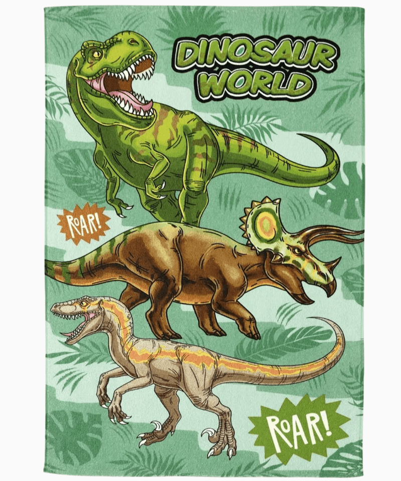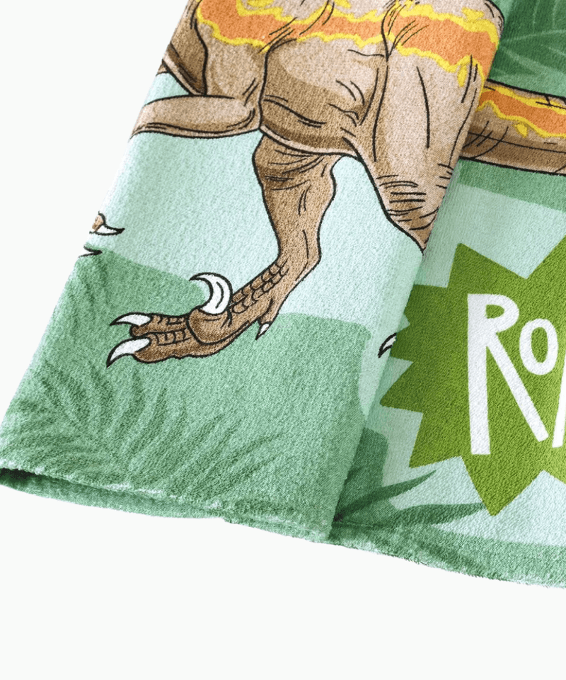 O grande diferencial desta toalha temática é sua estampa vibrante e detalhada de dinossauros. O design cartoonizado exibe três criaturas pré-históricas distintas em um fundo verde claro com folhagens, incluindo um dinossauro verde semelhante a um T-Rex com a inscrição "DINOSAUR WORLD" e balões de fala "ROAR!", um Triceratops marrom e um Velociraptor creme. Esta toalha infantil divertida com estampa de dinossauro é perfeita para encantar os pequenos apaixonados por esses seres pré-históricos, adicionando um toque lúdico e colorido ao pós-banho.