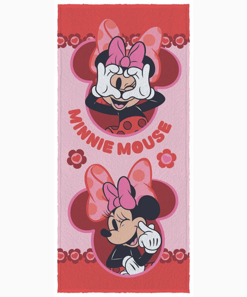 Com uma estampa vibrante e lúdica da Minnie Mouse, personagem clássica e adorada da Disney, esta toalha de banho Minnie Mouse apresenta a Minnie em poses divertidas, com seu icônico laço rosa e vestido vermelho de bolinhas. O design inclui a frase "MINNIE MOUSE" em letras curvilíneas e detalhes de flores com corações, tudo em tons de rosa e vermelho, criando um visual encantador. É a toalha Disney original ideal para uso em casa, na praia ou na piscina, acompanhando as aventuras das meninas com muito charme.