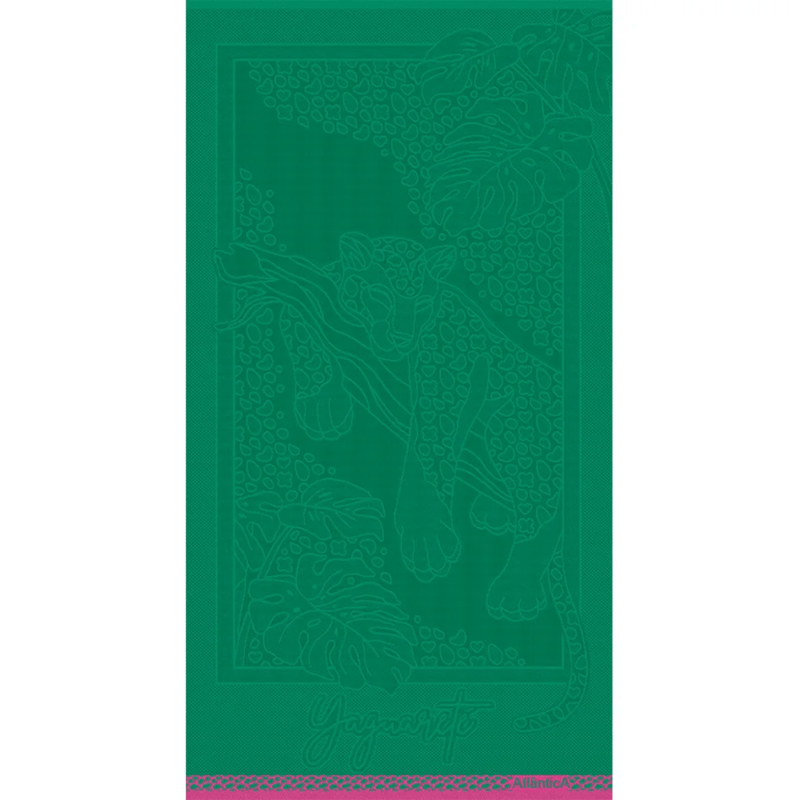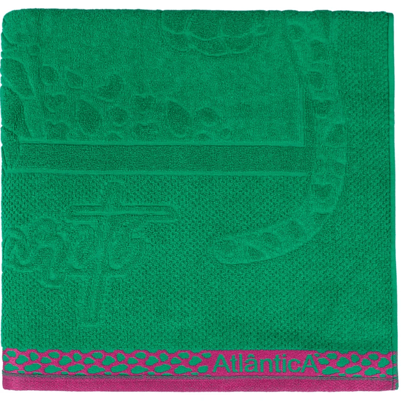 Confeccionada em 100% Algodão de alta qualidade, a Toalha Atlântica é macia ao toque e possui secagem rápida, um diferencial para o uso contínuo. Suas dimensões amplas de 80cm x 1,50m proporcionam excelente cobertura e conforto, tornando-a uma toalha grande para praia. O design moderno apresenta uma base verde vibrante com estampa de motivos orgânicos e curvilíneos, complementada por uma faixa decorativa proeminente em magenta, que adiciona um toque de elegância e sofisticação.