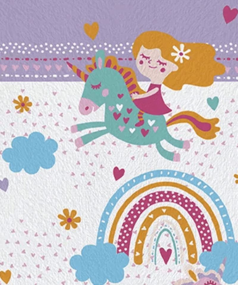 Com um visual lúdico e encantador, a estampa desta toalha unicórnio Lepper apresenta um universo de fantasia. Unicórnios graciosos, arco-íris vibrantes e nuvens coloridas adornam a peça, criando um cenário alegre. O design retangular exibe bordas em tom de lilás com detalhes em branco, enquanto o fundo branco texturizado realça as figuras principais. Meninas cavalgando unicórnios turquesa e rosa, um grande arco-íris em tons de rosa, laranja, amarelo e roxo, e um unicórnio branco interagem em um ambiente de nuvens azuis claras, estrelas e corações, tornando cada momento mais divertido.