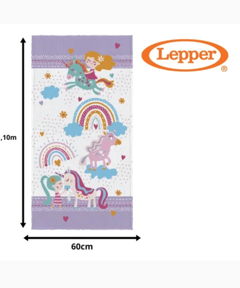 No tamanho de 60x110 cm, esta toalha infantil unicórnio é perfeitamente dimensionada para o conforto e a praticidade das crianças, seja para o banho em casa, um dia na piscina ou na praia. A união de beleza, funcionalidade e a reconhecida qualidade Lepper Kids faz desta toalha infantil 95 algodão a escolha ideal para pais que buscam um produto durável, confortável e que estimule a imaginação dos pequenos.