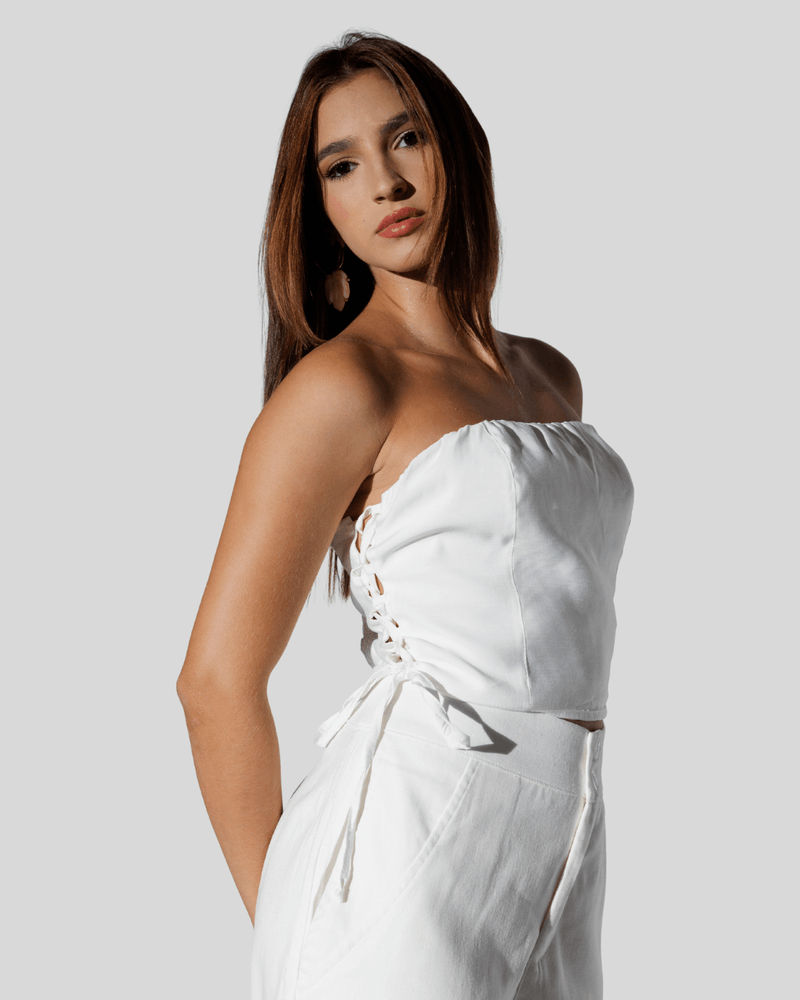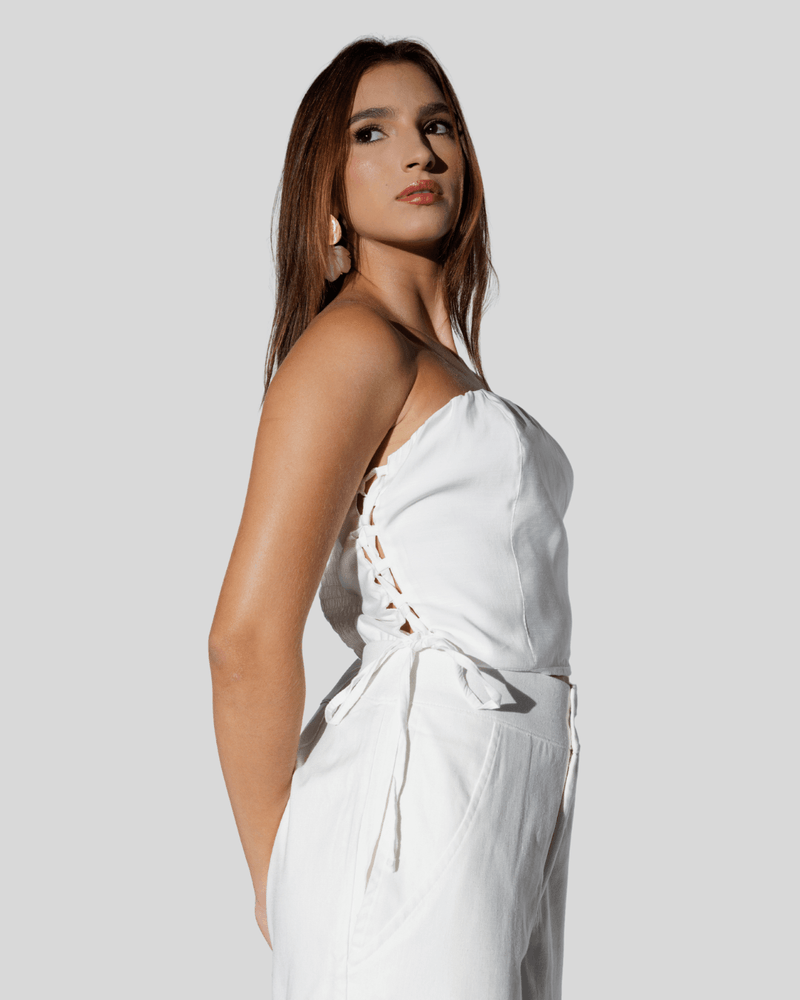 Confeccionado com uma composição de 92% Viscose e 8% Poliéster, o tecido oferece um toque suave e agradável à pele, além de garantir durabilidade e um caimento impecável. O grande diferencial é a amarração lateral tipo corpete, que apresenta ilhoses e cadarços, formando um delicado laço na parte inferior. A parte superior do top possui um acabamento franzido ou elástico, adicionando uma textura sutil e um ajuste confortável.