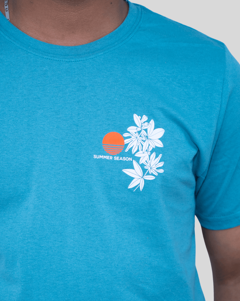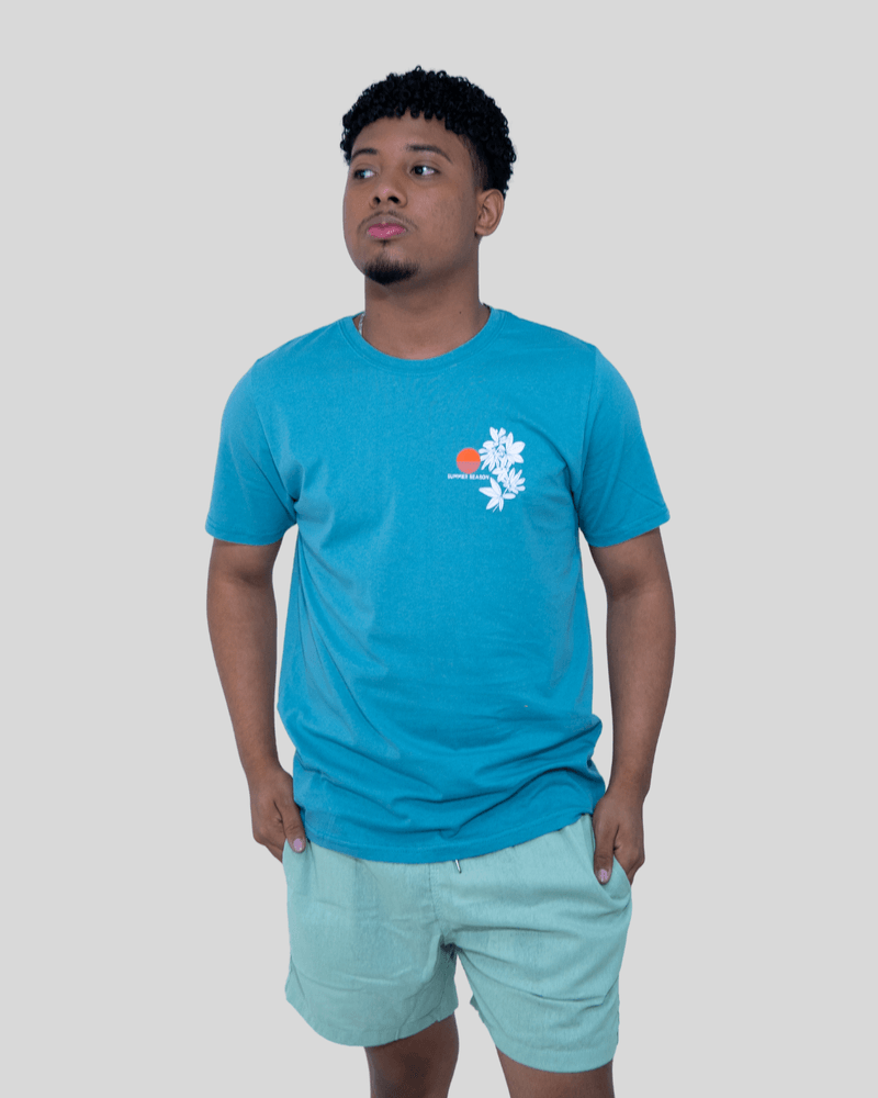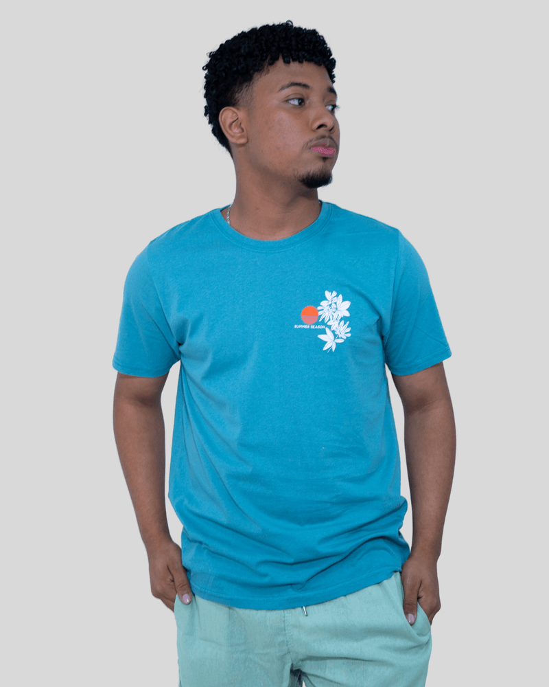 "Summer Season", trazendo uma atmosfera solar e relaxada ao visual. Com gola redonda clássica e mangas curtas, sua modelagem padrão proporciona um caimento impecável, sendo perfeita para combinar com bermudas de linho ou moletom.