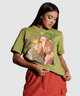 A estampa vibrante, conforme observado nas imagens, apresenta um leopardo e uma figura feminina estilizada com lábios vermelhos e uma flor no cabelo, em um cenário de folhagem exuberante com elementos botânicos e um sol ao fundo. As cores ricas da estampa, como amarelo, laranja, vermelho, preto e marrom, contrastam harmoniosamente com a base da camiseta, que pode variar em tons como verde oliva. Esta t-shirt moderna feminina é pensada para a mulher que valoriza peças que combinam moda feminina casual com um toque artístico e marcante, sendo fácil de combinar para diversas ocasiões descontraídas.