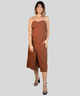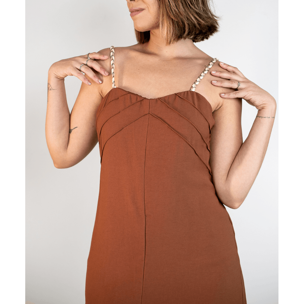 Visualmente, o vestido se destaca por sua cor marrom avermelhada ou ferrugem, sem estampas, que confere um ar sofisticado. As alças finas são adornadas com pequenas contas redondas e claras, e o decote em formato de coração ou V suave complementa a silhueta. O corpete possui pregas horizontais que adicionam textura, enquanto a saia de corte reto com a fenda frontal, que se estende até a altura da coxa, proporciona um toque de feminilidade e ousadia. Este vestido casual elegante é um verdadeiro destaque para o guarda-roupa.
