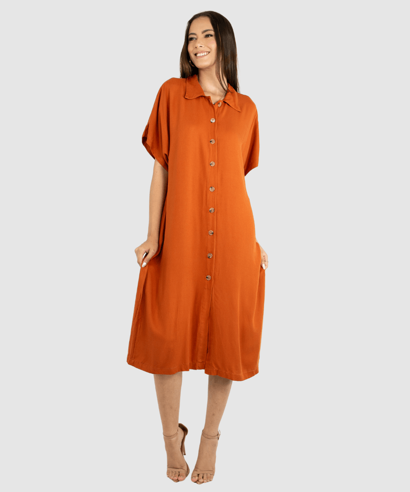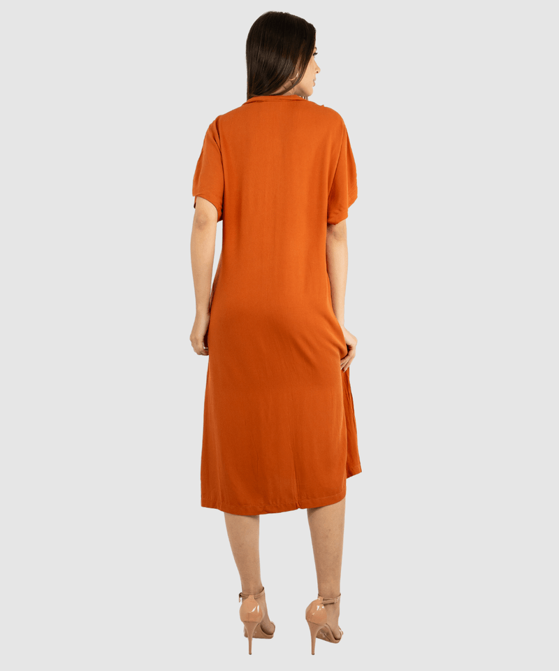 Este vestido feminino se destaca pela sua versatilidade, sendo perfeito para compor looks casuais elegantes. A peça conta ainda com uma pequena abertura frontal discreta na barra, que adiciona charme e liberdade de movimento, e bolsos laterais que elevam a funcionalidade. A cor predominante, como visto nas imagens, é um vibrante laranja terroso ou terracota, com botões de tonalidade marrom clara ou bege, realçando o estilo único do Vestido Chamise Midi Viscose Com Botões Ana Xis.