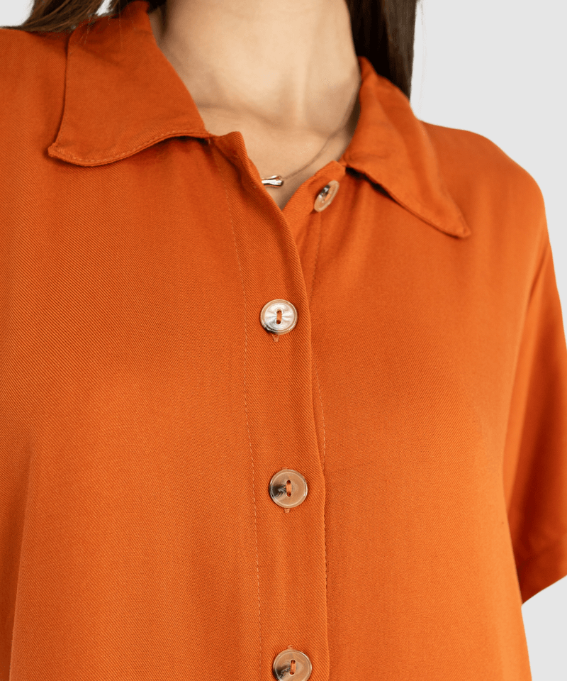 - Recomenda-se lavagem delicada e secagem à sombra para preservar as características da viscose e a vivacidade da cor laranja terroso.