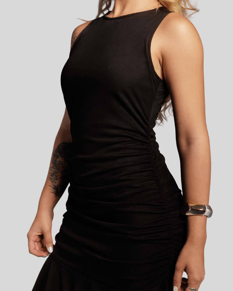 O grande diferencial deste modelo é a sua barra assimétrica, que apresenta um comprimento mais curto na frente, e a incorporação de uma delicada camada de tule na parte inferior. Esta camada transparente, visível como babados ou camadas na lateral, adiciona movimento e um charme festivo à peça, tornando o Vestido Novara ideal para celebrações, coquetéis e ocasiões onde o estilo e a elegância são essenciais.