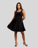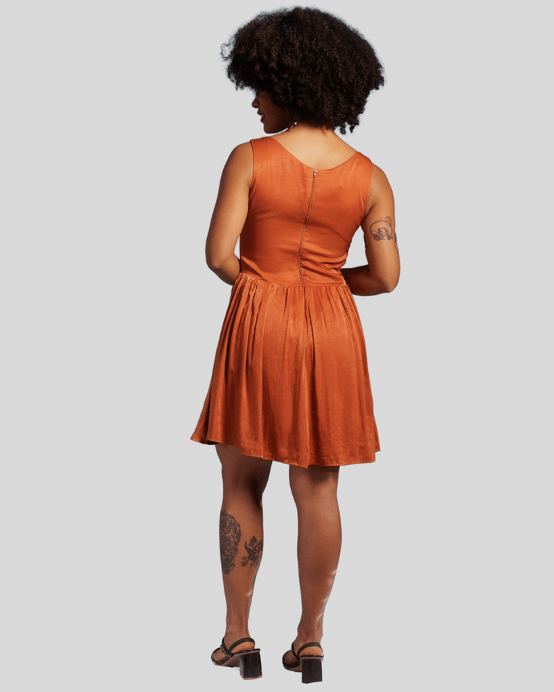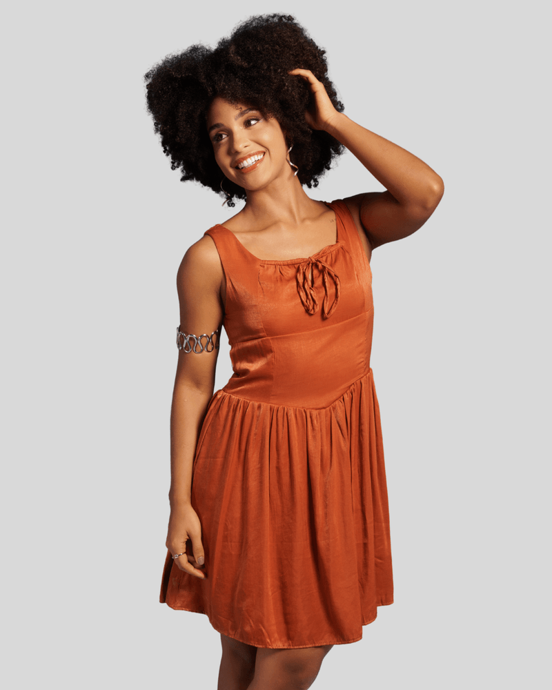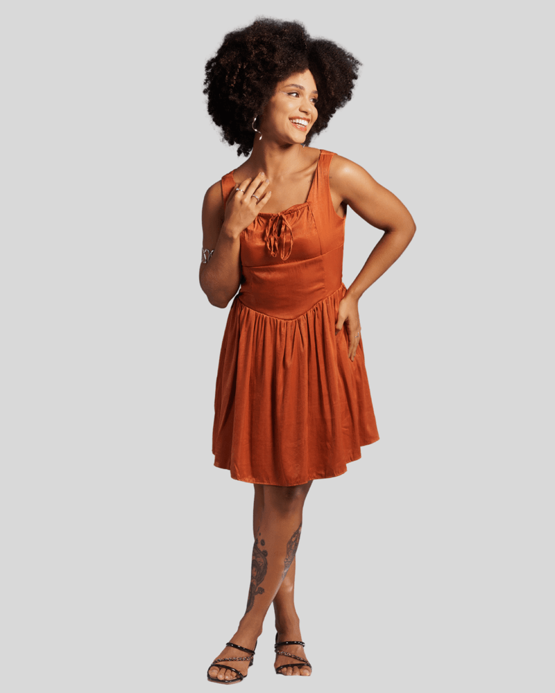 Este vestido curto destaca-se pela sua cor sólida, um elegante laranja queimado ou terracota, que adiciona um toque de sofisticação. Possui alças largas e um charmoso decote quadrado, realçando a silhueta. Um detalhe de amarração com cordões na parte central do busto cria um efeito franzido, conferindo um charme extra e um visual único. O corpete ajustado e a saia franzida na cintura, com formato evasê e comprimento acima do joelho, garantem um movimento fluido e um caimento elegante.