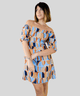 modelagem solta ao corpo e foco total nos ombros. A peça é caracterizada por uma estampa abstrata em tons de azul, terracota, bege e marinho, criando um visual artístico e contemporâneo.