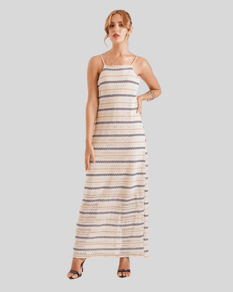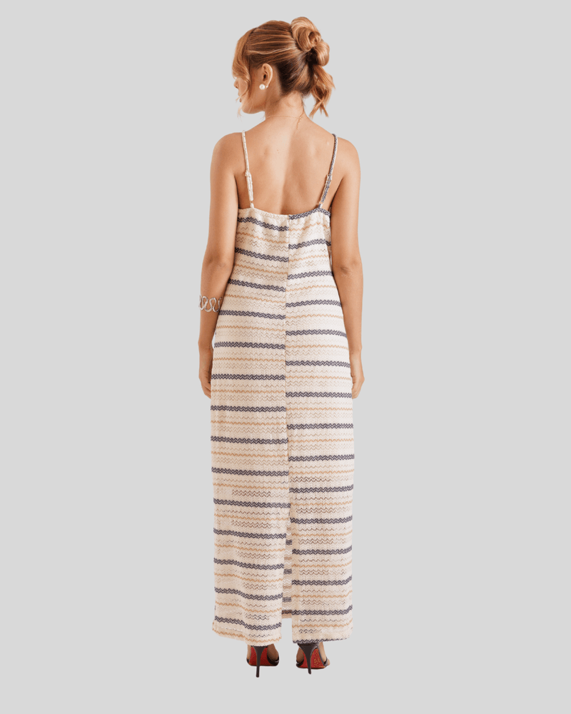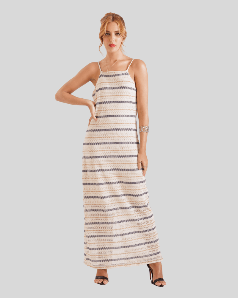 Este modelo se destaca pela sua estampa de listras horizontais onduladas, que remetem a um charmoso padrão em zigue-zague, adicionando um toque de originalidade ao design. As cores predominantes incluem um fundo claro, que se assemelha a um off-white ou bege muito claro, complementado por listras em dois tons distintos: um cinza escuro ou preto e um bege ou marrom claro. Essa combinação de cores e padrões confere ao vestido uma estética moderna e atemporal, fácil de combinar com acessórios variados, tornando-o uma peça-chave no guarda-roupa feminino.
