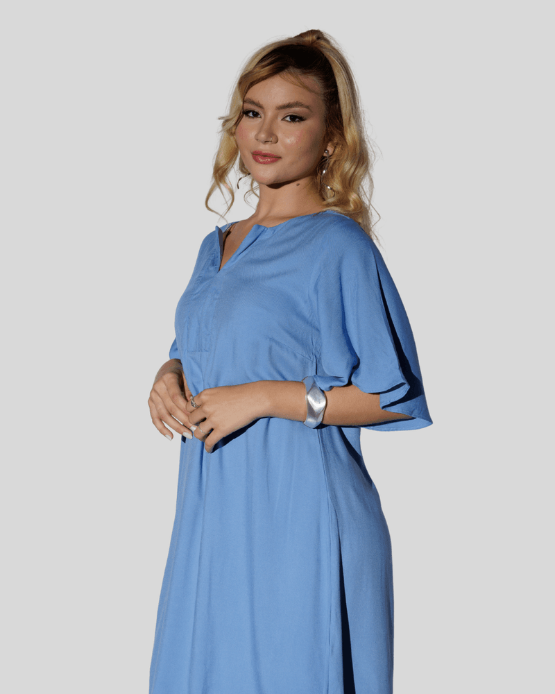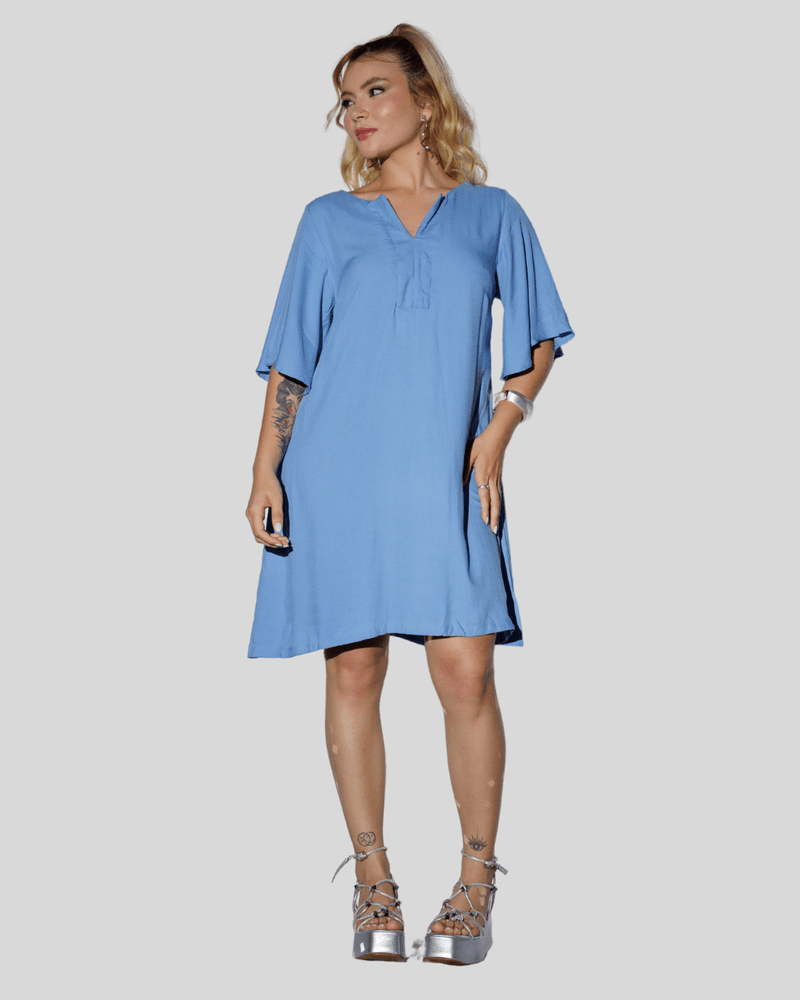 O design do vestido se destaca pelo seu decote em V, complementado por uma gola que adiciona um toque sofisticado. As mangas são curtas e largas, oferecendo liberdade de movimento e um visual despojado. Com um corte reto e solto, o vestido desce de forma relaxada, e sua cor azul predominante, em um tom claro e sólido, realça a simplicidade elegante da peça. Detalhes sutis, como uma pequena carcela com botões ou costuras decorativas abaixo do decote, enriquecem o visual sem sobrecarregar.