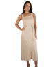 O modelo se destaca por suas alças finas e um cinto alto fixo que marca a cintura, apresentando uma fivela retangular de metal prateado e passantes, conforme detalhado nas imagens. Os bolsos laterais funcionais, com aberturas superiores visíveis, adicionam praticidade ao design. O fechamento é feito por um zípper invisível nas costas, garantindo um acabamento impecável. Uma discreta fenda frontal, que se estende da altura dos joelhos até a barra midi, confere charme e modernidade ao visual, tornando-o versátil para transitar do casual chic ao elegante com facilidade. É a escolha perfeita para mulheres que buscam um look sofisticado e confortável.