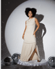 Com um design elegante e contemporâneo, este vestido longo apresenta uma cor predominante bege claro ou creme, ideal para criar looks sofisticados. O modelo sem mangas e o decote redondo simples proporcionam um visual clean e versátil. Um detalhe marcante é a faixa horizontal na altura do quadril, que pode ser interpretada como o detalhe palito, enriquecida com pequenos pontos perfurados ou um delicado trabalho de rendado, que adiciona um toque de charme e diferenciação à peça. A saia, ligeiramente franzida abaixo da faixa, confere um caimento fluido e possui uma fenda alta na lateral esquerda, que adiciona um toque de sensualidade e liberdade de movimento.
